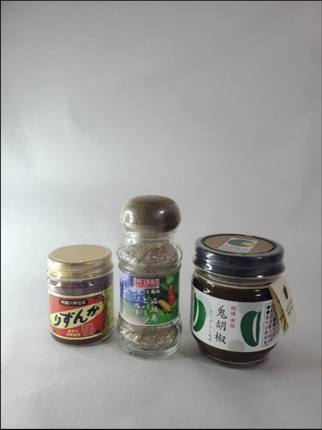 Onikosho Miso, Pipachi Salt, Ginjyo Kanzuri, Culture Guide booklet, Furoshiki wrapping.